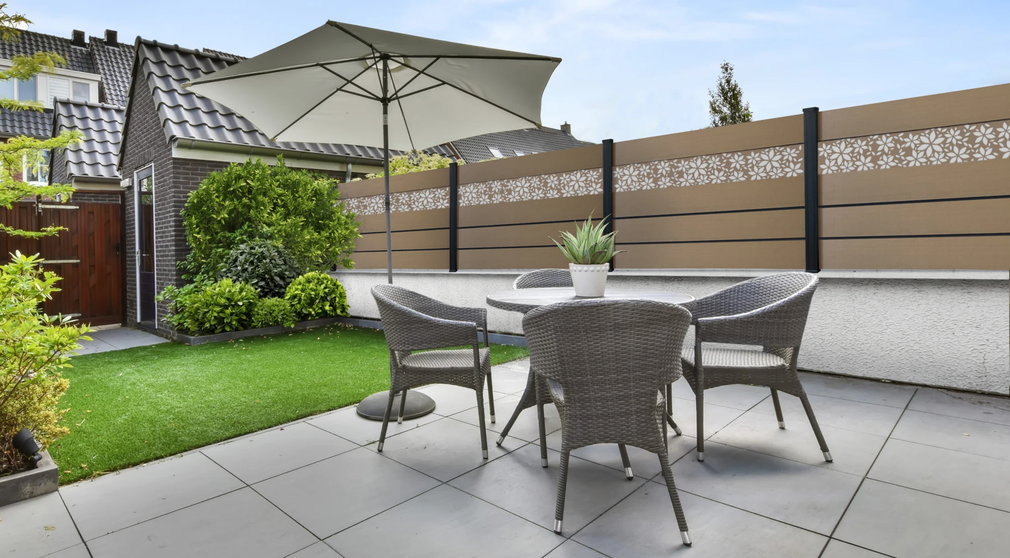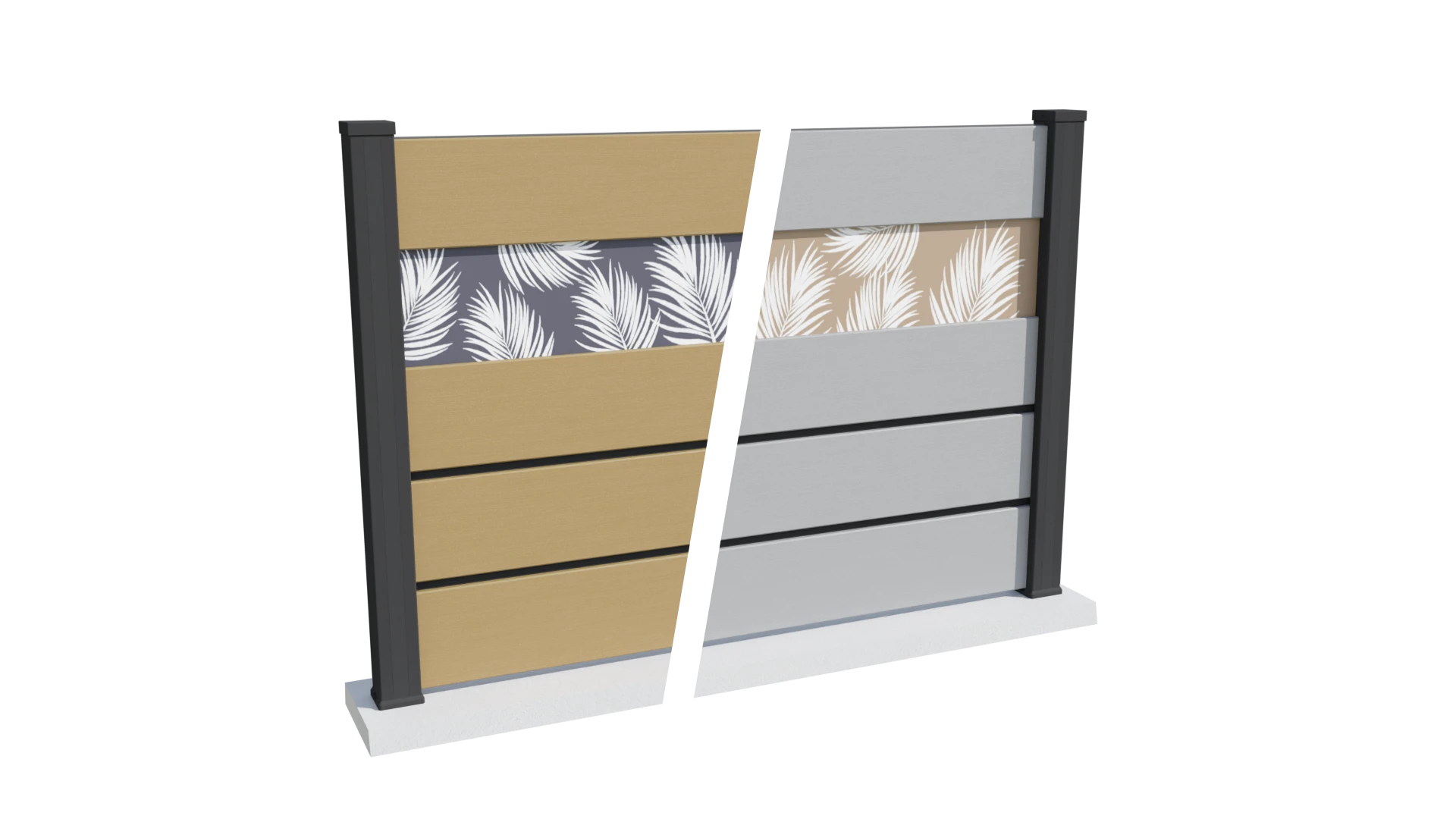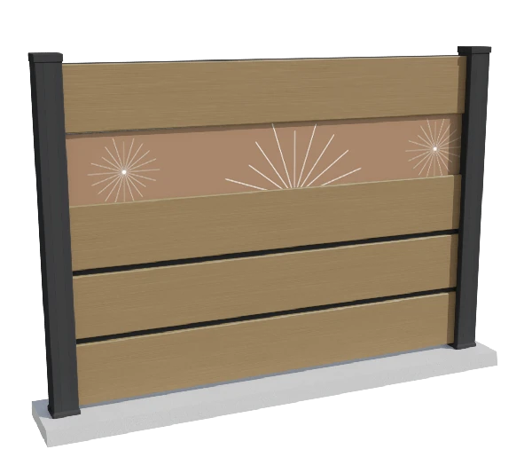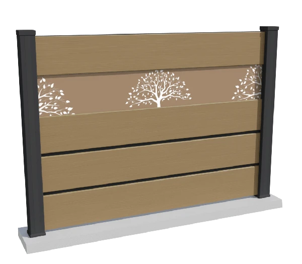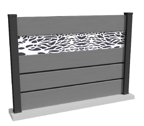 Un brise-vue en composite avec inserts aluminium et impression décorative personnalisable, pour créer une clôture réellement unique