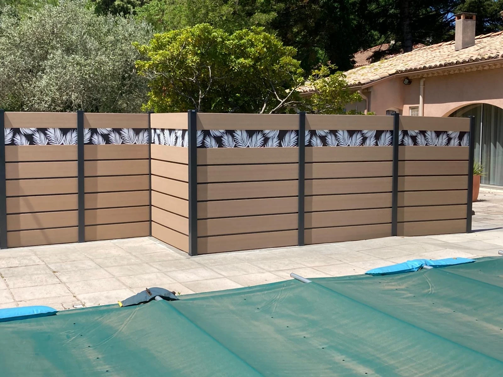 cloture-composite-brise-vue-beige-impression-tropicale-pose-barcelos