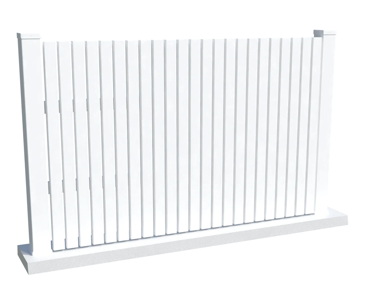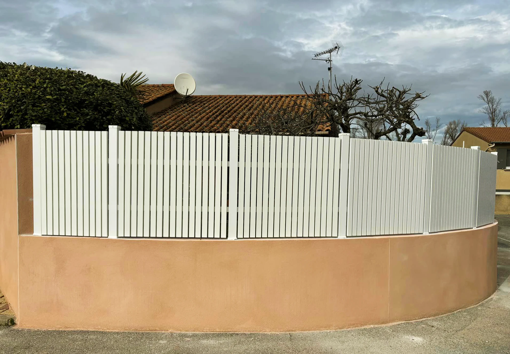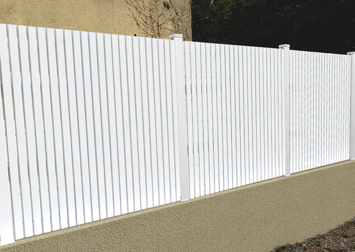 Une clôture blanche aux lames verticales fines, dimensionnées sur mesure